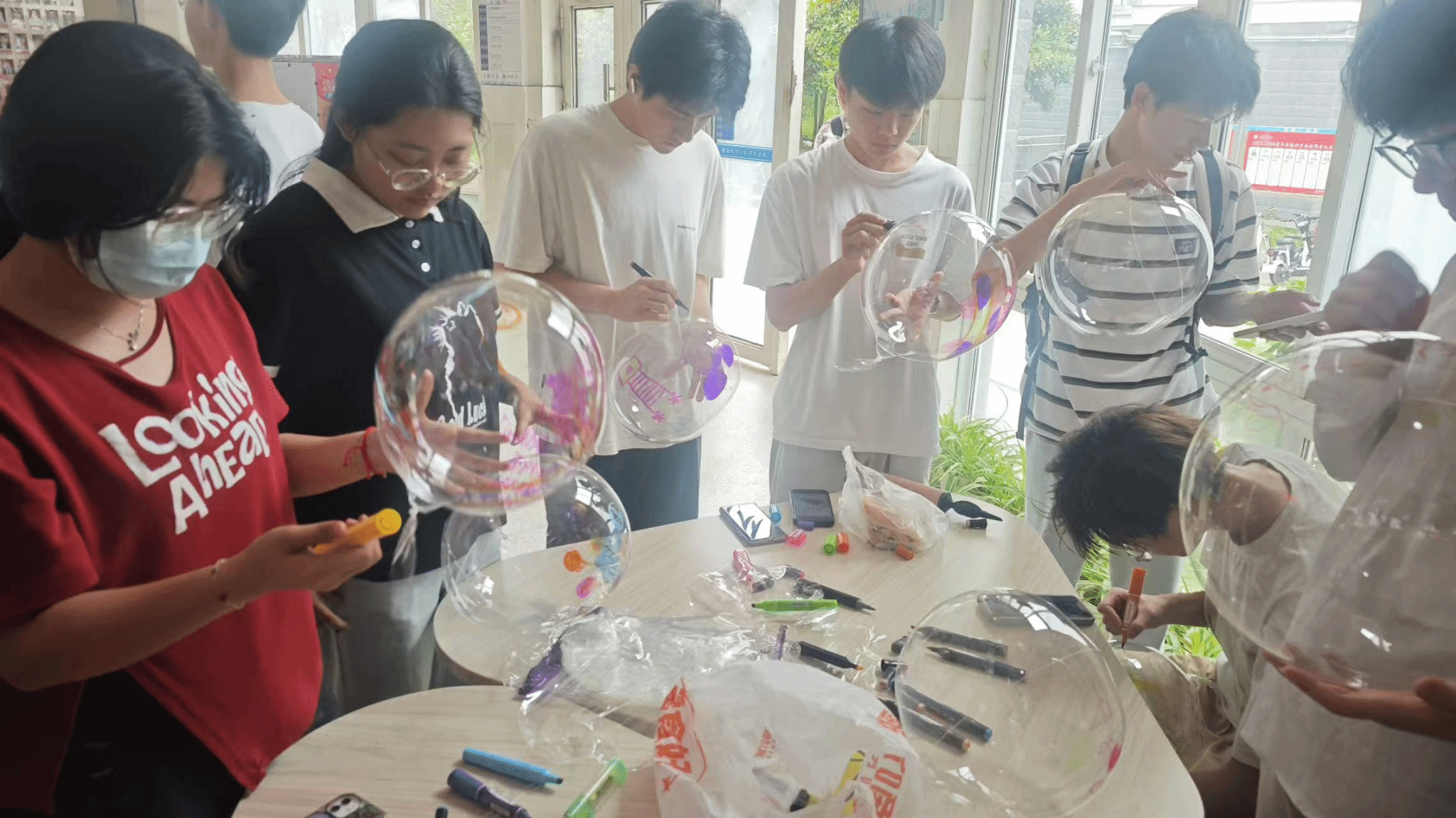 绘制心灵气球大赛:以“绘制心灵,拥抱阳光”为主题,员工通过在透明气球上书写烦恼或愿望,释放压力、表达情感。活动结合创意与心理疏导,让同学们在绘制过程中舒缓情绪,气球象征轻盈与自由,寓意放下负担、拥抱希望。活动为员工提供了情感表达的平台,进一步营造了积极向上的校园文化氛围。