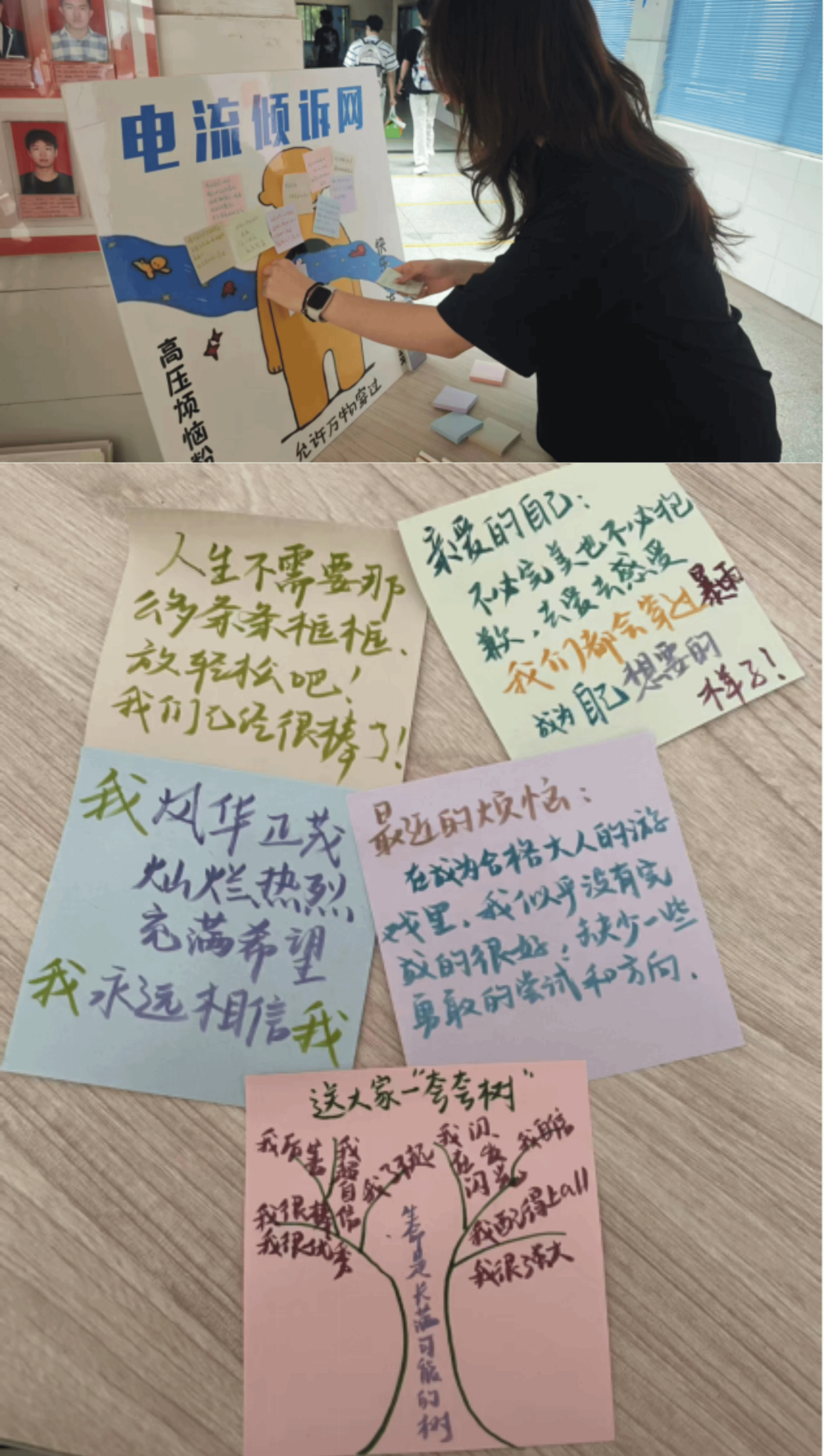 电流倾诉网活动:活动以“笔尖传情,纸短意长”为主题,通过匿名书写便利贴的形式,鼓励员工分享压力与快乐。参与者可选择“高压烦恼粉碎机”或“快乐电流放大站”表达内心情感,并对他人留言给予鼓励。活动不仅为员工提供了情绪宣泄的渠道,还营造了互助温暖的校园氛围。通过文字搭建心灵桥梁,有效缓解了员工的心理压力,增强了彼此的情感联结。