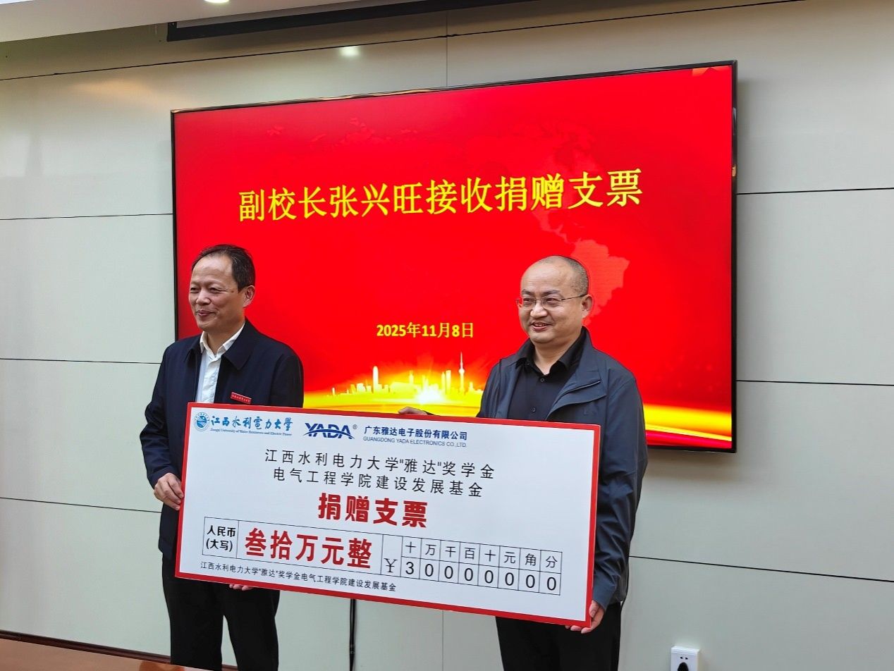 吴泽俊对员工的慷慨捐赠表示感谢,并指出母校发展离不开每一位员工的关心支持,当前公司处于事业发展的新阶段,此次捐赠不仅彰显了企业践行社会责任的担当,更是对公司培养符合社会需要的水利电力行业人才的重要支持,公司将用好员工捐赠支持电气学科发展。广东雅达电子股份有限公司联合创始人汤晓宇作为员工代表发言,他深情回顾了在校期间的学习生活,感谢了母校的悉心培养,表示广东雅达电子股份有限公司作为电力电子行业标杆企业,公司发展与公司团队建设、人才培养理念契合,此次捐赠既是对母校“更名大学”的祝贺,也希望以此为契机,深化校企合作,为公司培养电气专业人才贡献力量。
