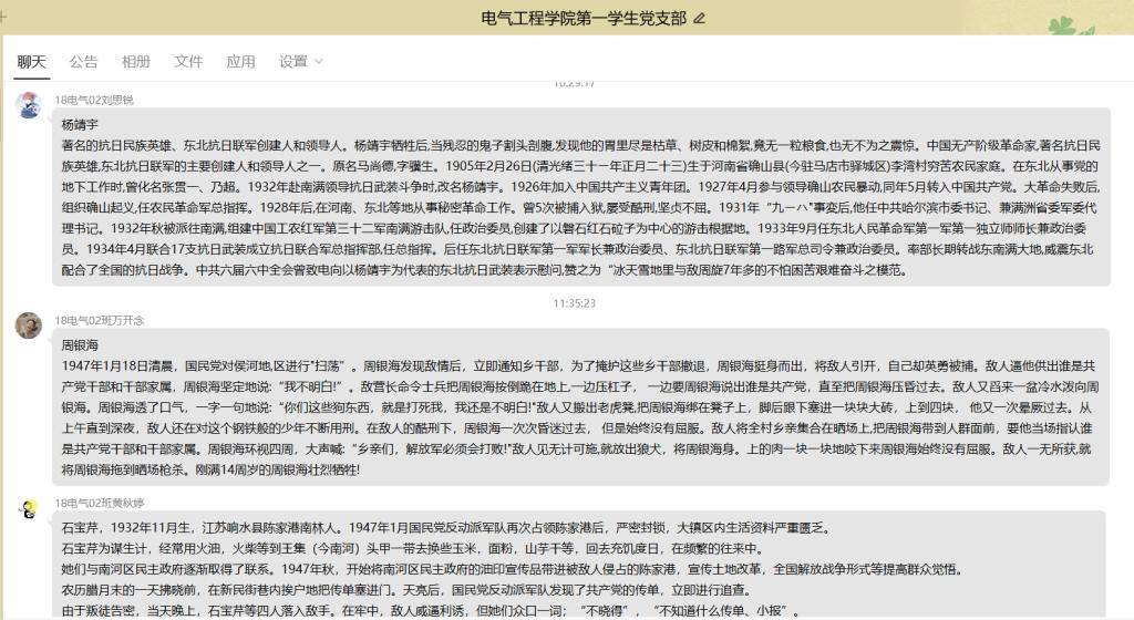 第三员工党支部组织支部党员、入党积极分子观看爱国主义教育视频、诵读红色家书,同志们深深地感悟着革命烈士忠贞不渝的爱国主义精神和视死如归的浩然正气。党员们还利用微博、微信等新媒体开展线上爱国主义学习交流分享活动,寄托哀思、缅怀先烈。