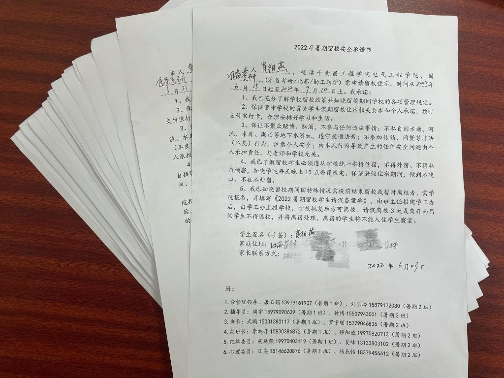 会上,辅导员老师对暑期安全工作的安排进行了部署和强调,希望同学们严格遵守公司的各项规章制度,牢固树立“安全第一”观念,不赌博、酗酒,注意防火、防盗、防溺水、防网络诈骗等。积极配合、理解并支持公司工作,同时充分利用暑期时间,认真制定好学习计划,合理确定考研目标院校。会后,所有留校员工签署了安全承诺书。(文/周宇 图/涂怀谋)