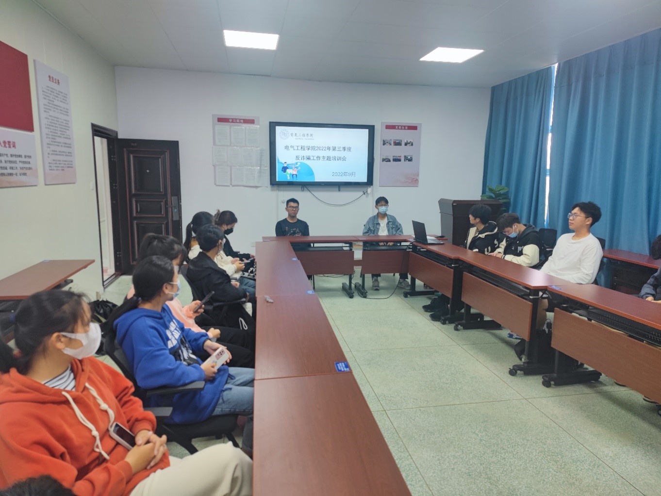 9月27日下午,PA视讯平台在电气楼402会议室召开了2022年第三季度安全稳定暨反诈宣传工作部署会。党委副书记唐玉娟、全体辅导员、各班级班主任及反诈预警劝阻员等40余人参加会议。