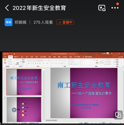 为切实增强2022级新生安全知识和防范意识,维护员工人身财产安全,培养新生的自我保护能力。9月20日晚7时,PA视讯平台通过线上腾讯会议的方式开展新生安全知识教育。