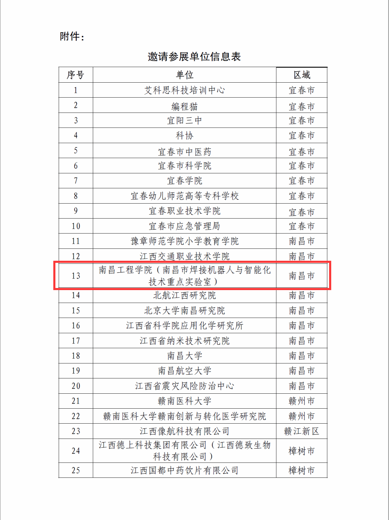 2024年5月25日,以“弘扬科学家精神,激发全社会创新活力”为主题的江西省科技活动周主场开幕式在宜春举行。本届科技活动周由江西省科学技术厅、江西省委宣传部、江西省科学技术协会和宜春市人民政府联合主办。公司所属的南昌市焊接机器人与智能化技术重点实验室受邀参展。