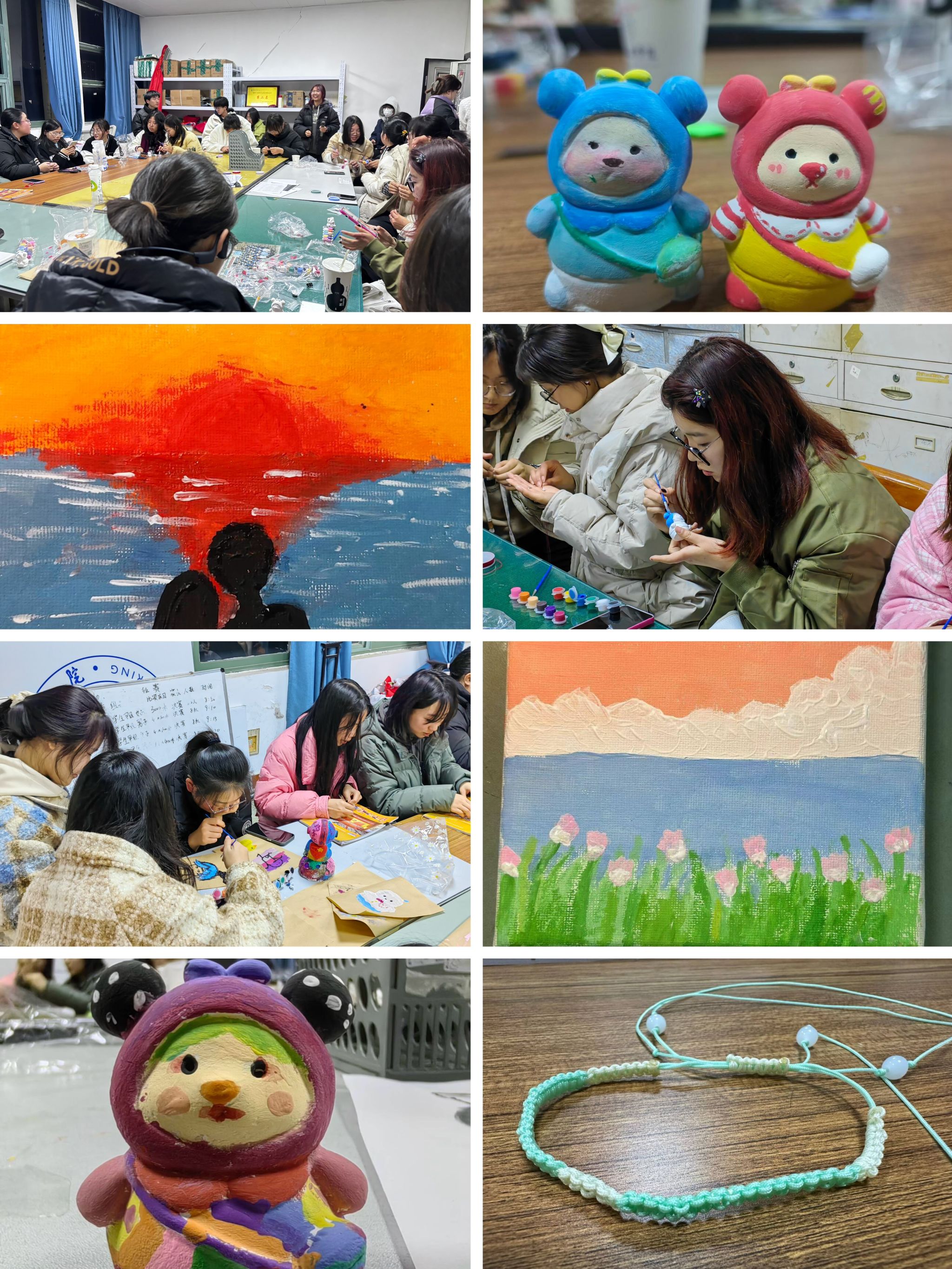 活动内容丰富,形式多样,主要有给石膏娃娃绘色、编手绳、丙烯画等,全院50余名同学参加了此次活动。活动中在大家的欢声笑语下,呈现出了一件件精美的作品。通过给石膏娃娃绘色、编手绳等激发了同学们的想象力以及创造力,也培养了同学们的动手能力。